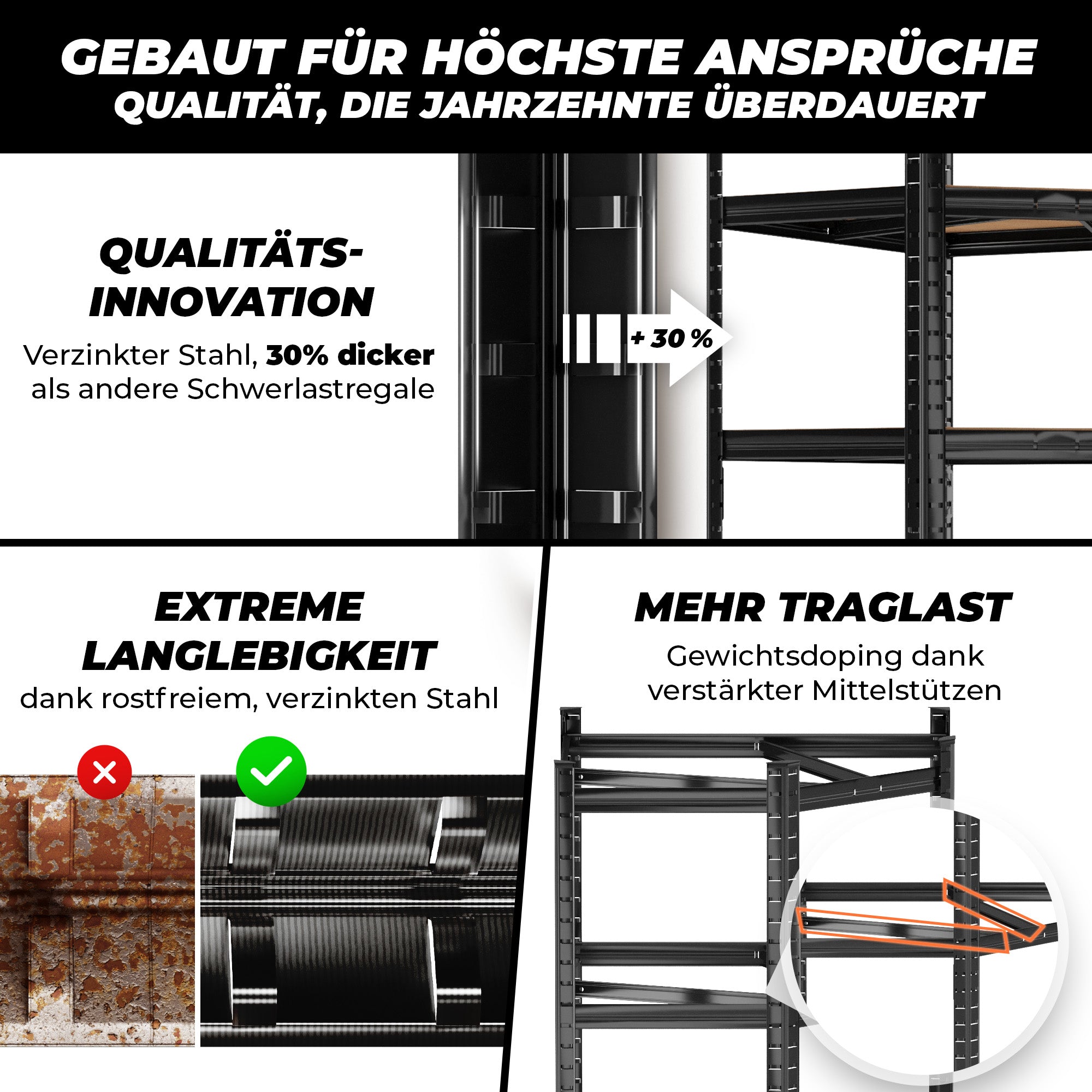Das ALL Premium Schwerlastregal ist die perfekte Lösung für anspruchsvolle Lagerbedürfnisse. Mit einer Gesamttraglast von 1250 kg und 250 kg pro Ebene ist es ideal für Garage, Werkstatt oder Lager. Es kombiniert höchste Belastbarkeit mit einem modernen Design und wurde als Testsieger mit der Note 1,3 ausgezeichnet.