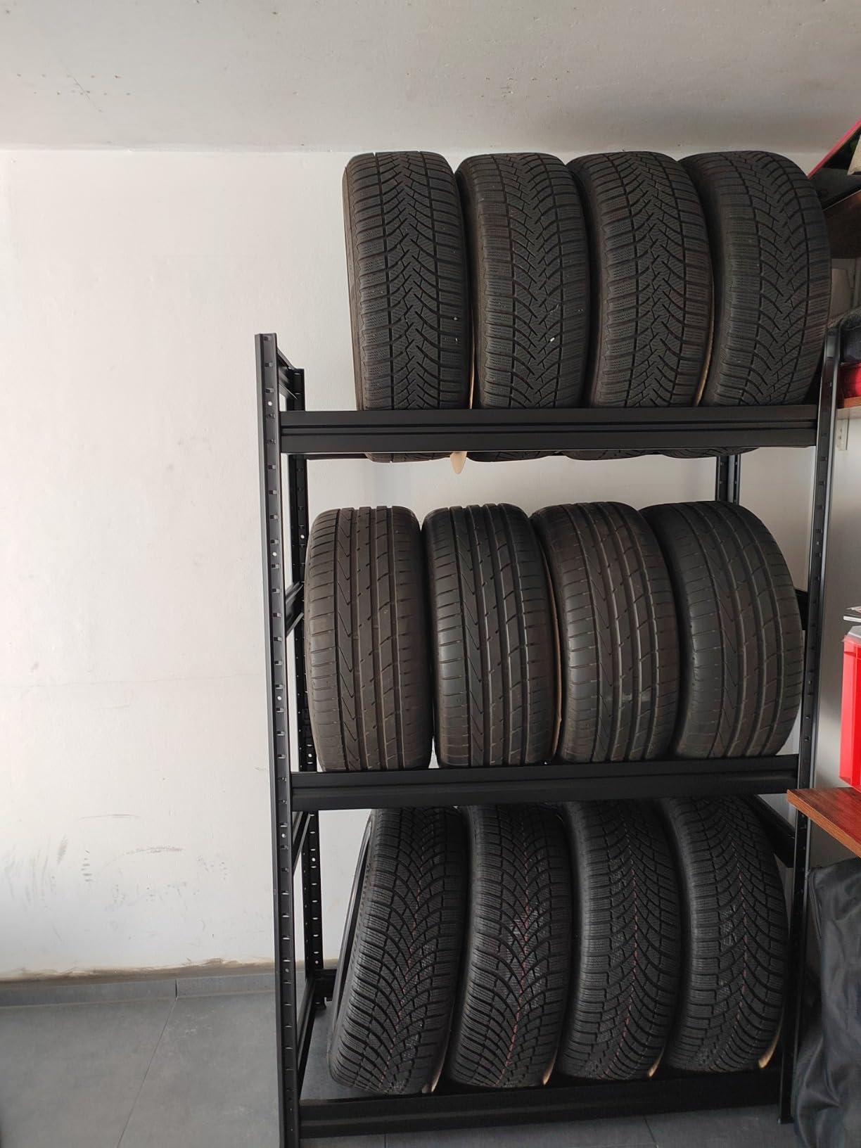 Das Regal verfügt über eine Traglast von 250KG und kann problemlos 12 Reifen tragen.