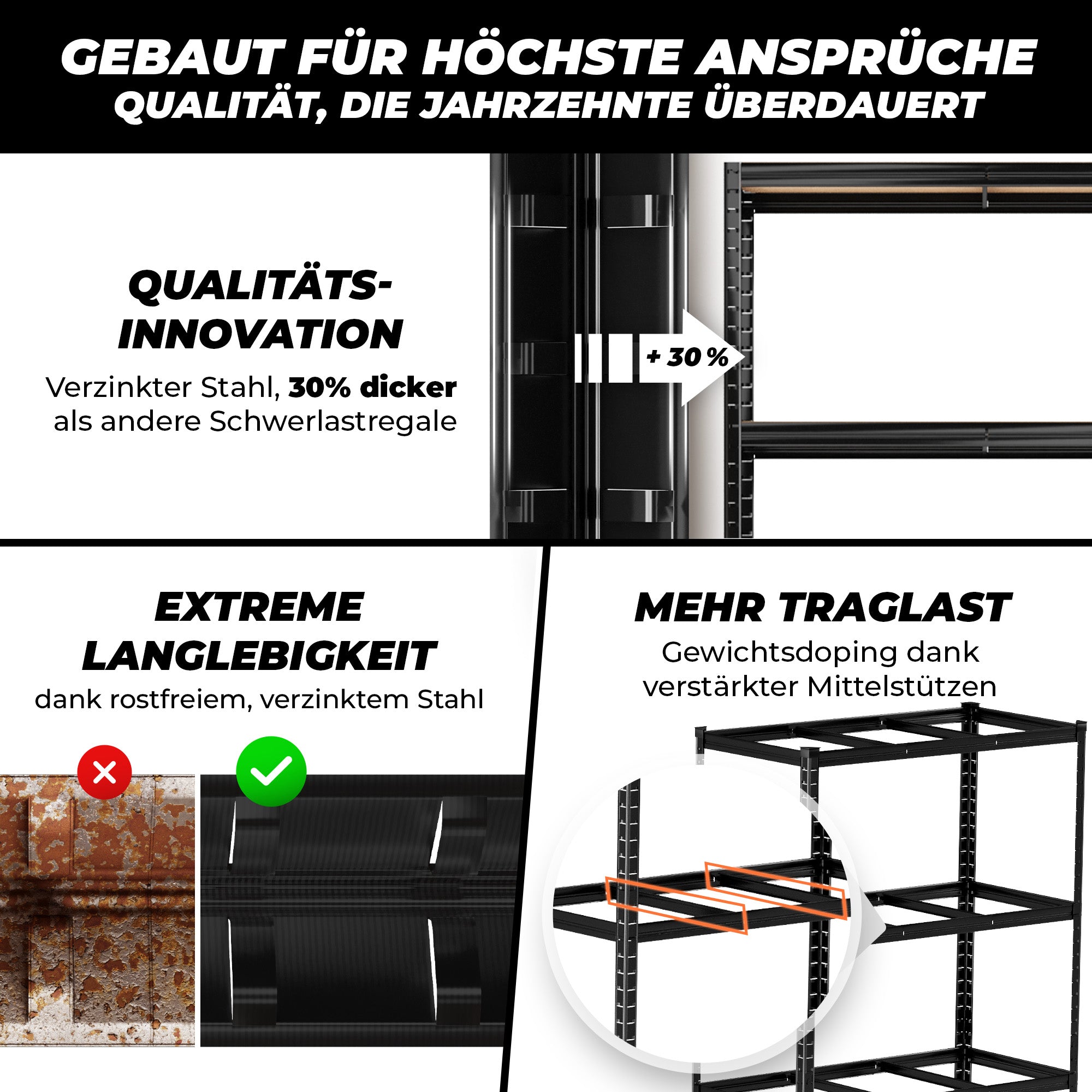 Absolut – das Regal besteht aus verzinktem Stahl und ist dadurch rostgeschützt. Ideal für Keller, Garage oder Werkstatt.